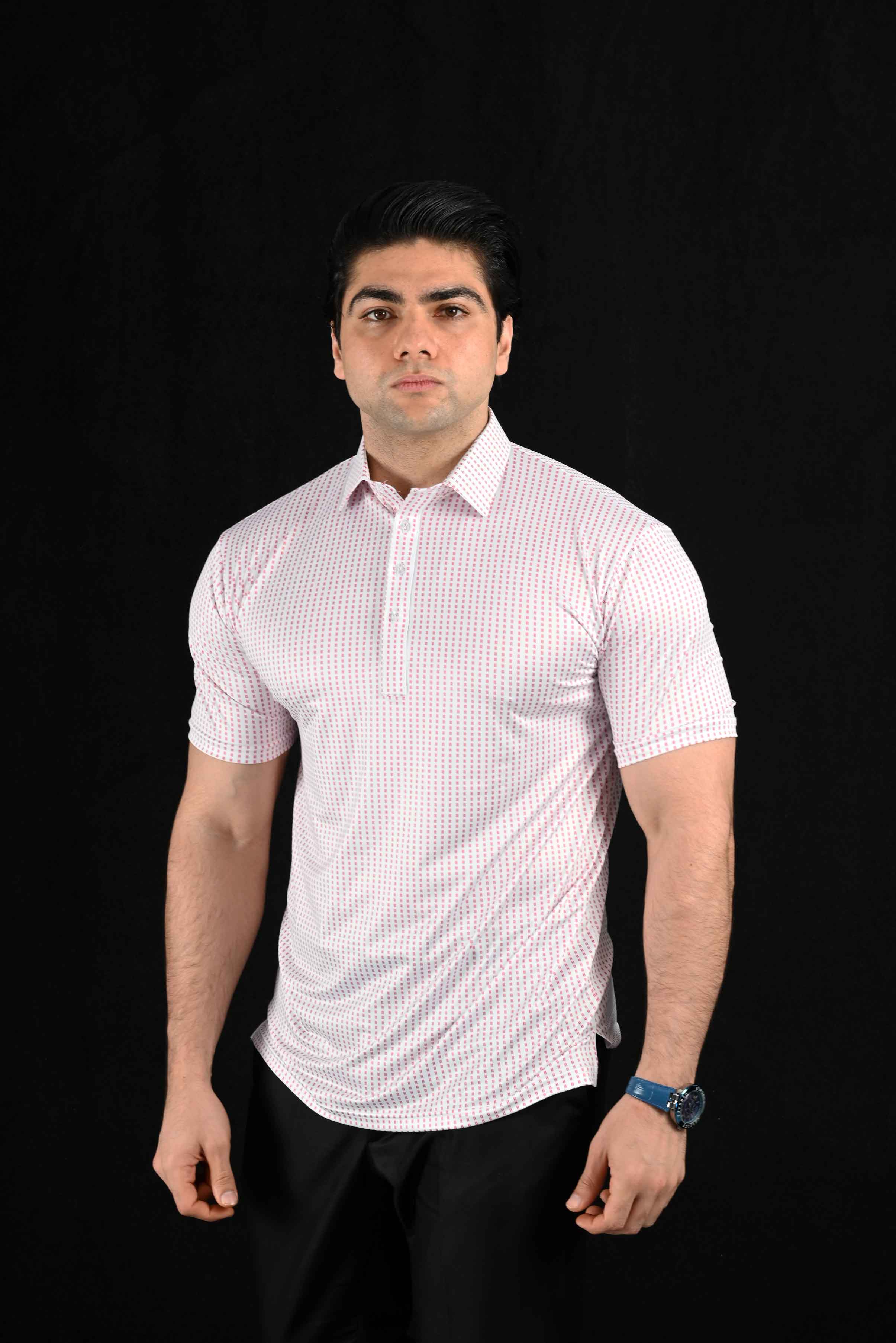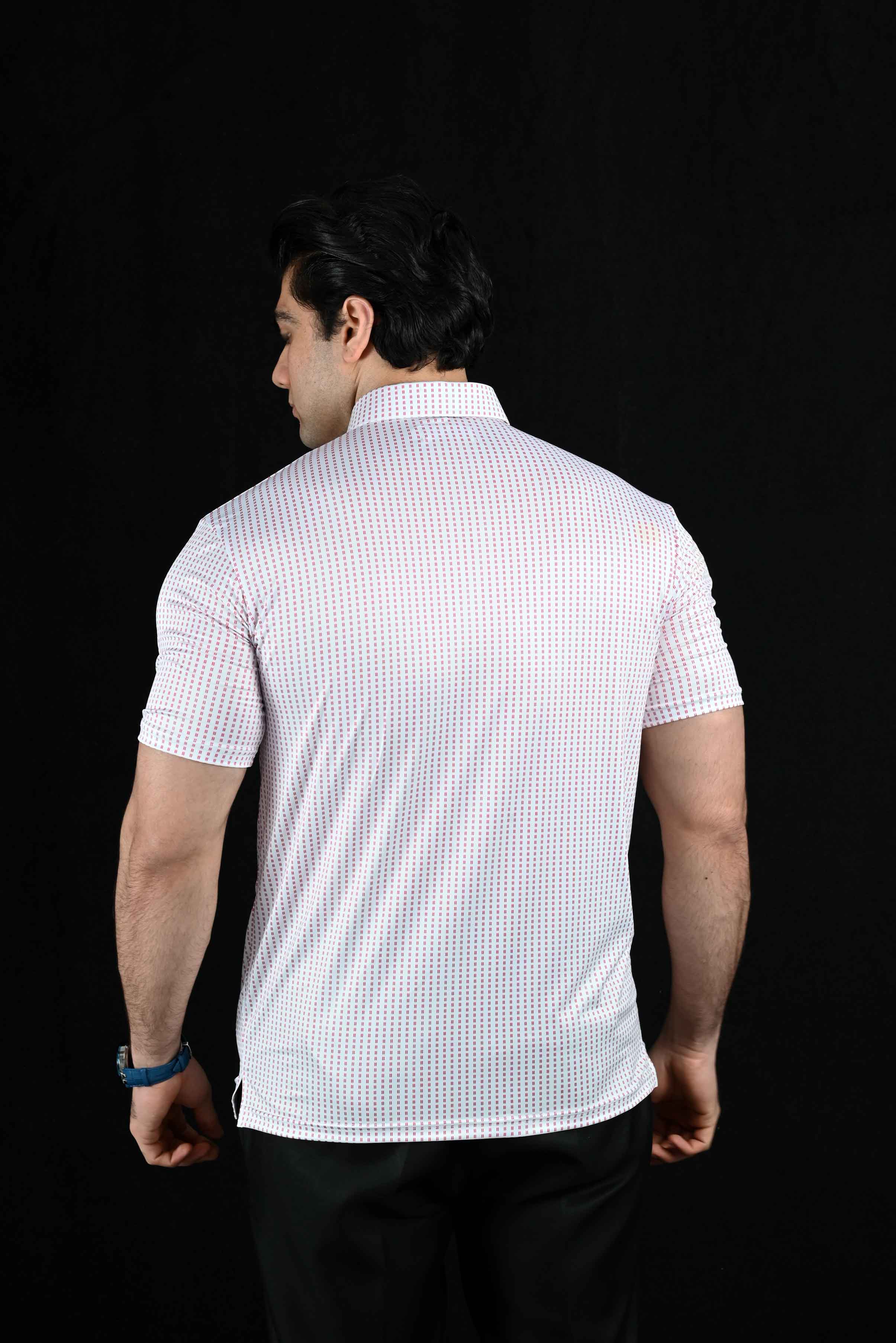 The Maroon Micro Dashes polo shirt combines timeless sophistication with lasting durability. Crafted from premium 4-way stretch fabric, this shirt provides a refined formal look that maintains its crisp structure, even after 40 washes. Designed to offer ultimate comfort, flexibility, and a sharp appearance, it's the perfect blend of elegance and everyday wearability.